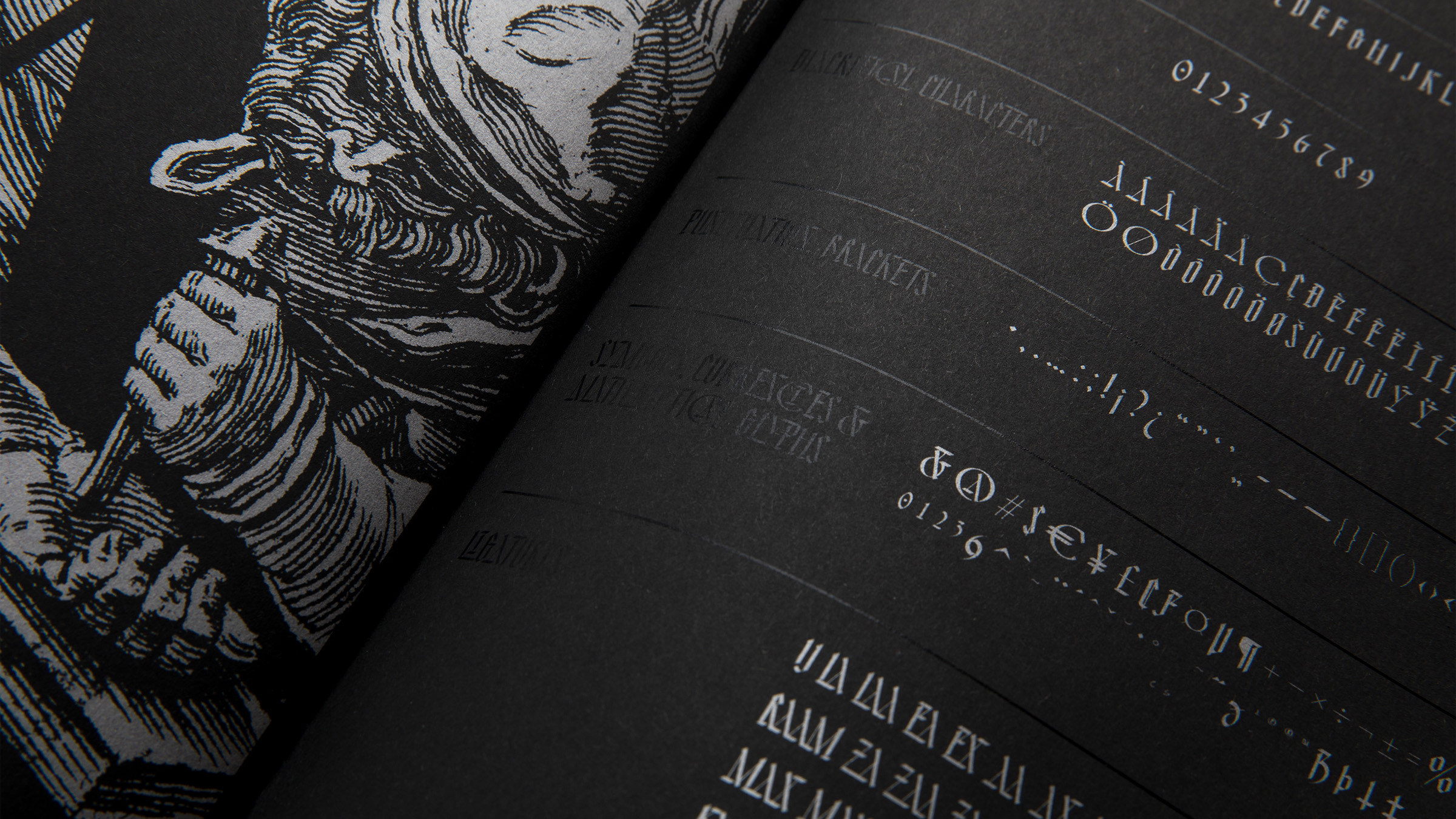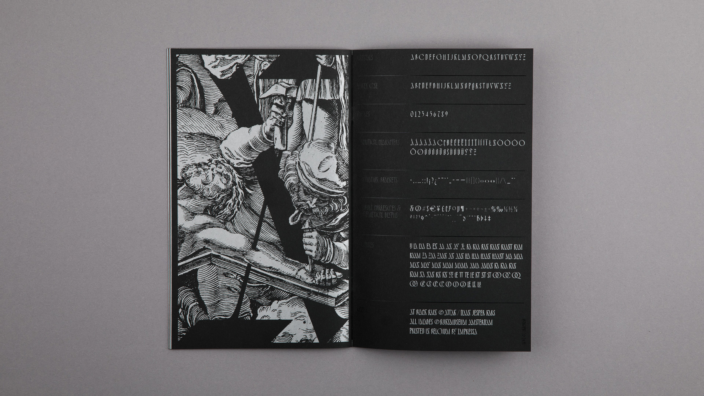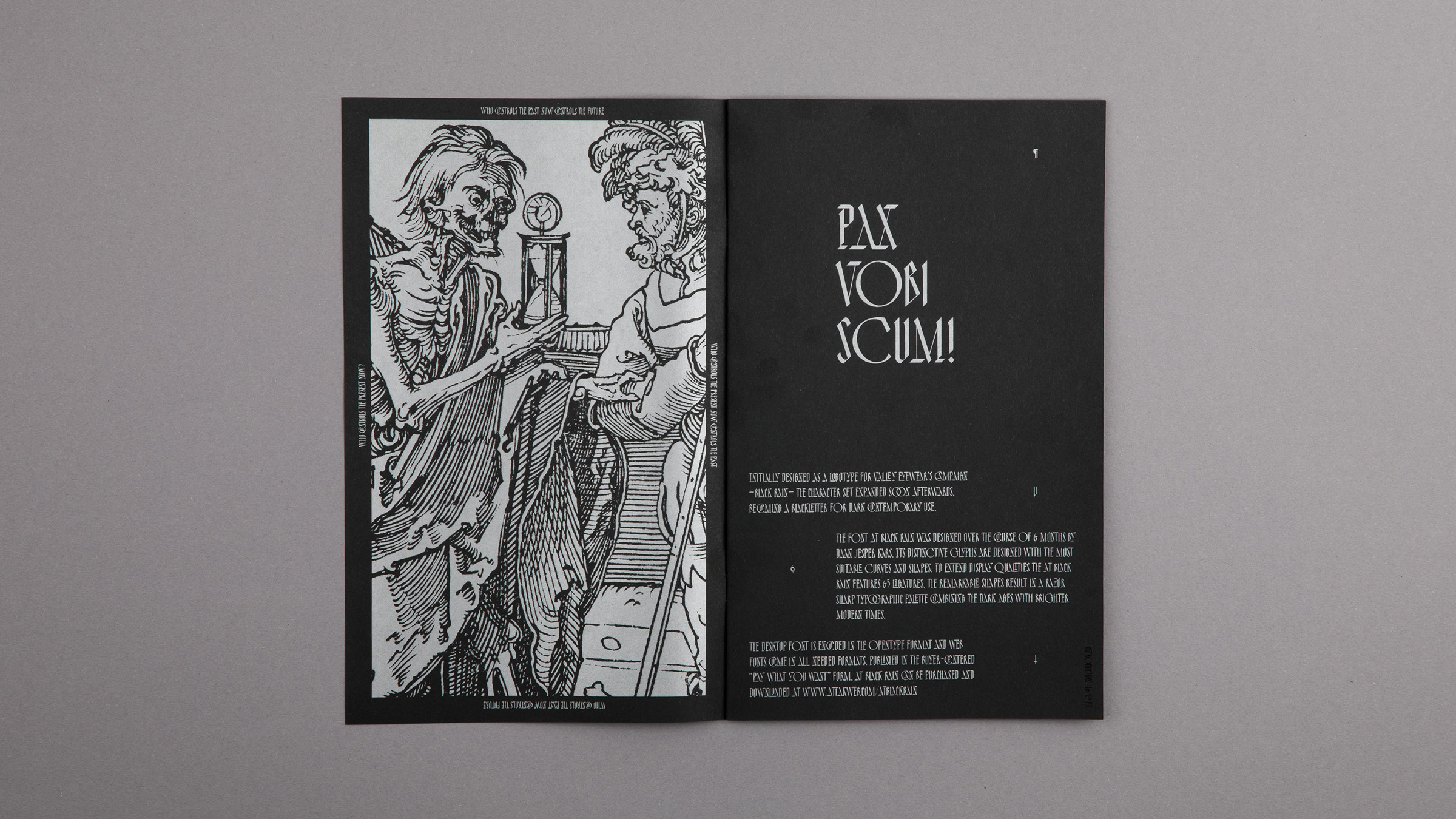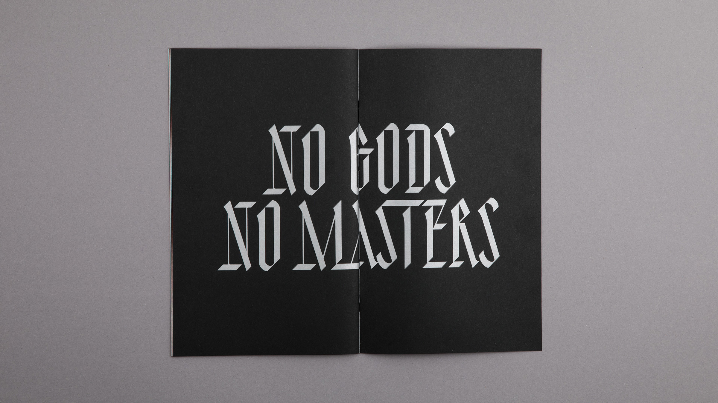 The font AT Violent Youth (previously known as AT Black Rain) was designed over the course of 6 months during my internship at ATTAK. Its distinctive glyphs are designed with the most suitable curves and shapes. To extend display qualities the AT Black Rain features 65 ligatures. The remarkable shapes result in a razor sharp typographic palette combining the dark ages with brighter modern times. Printed with black and silver ink on black paper.